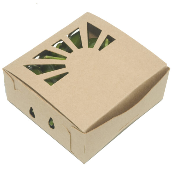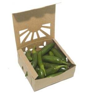 Replace plastic hinged clamshells with this recyclable Half Pint Sustainable Produce Container made from natural paperboard! It’s vented to allow air in and around the produce, keeping condensation at bay and preserving the freshness of your product. These vents also allow easy transitions to different temperatures. A strong anchor lock closure ensures a secure seal to prevent spillage or you can tuck the lid into the box itself for fast packaging. Perfect for grocery retail display and sale as well as for farmer’s markets and produce delivery companies. This traditional half pint size holds 6 oz or 1 dry half pint.